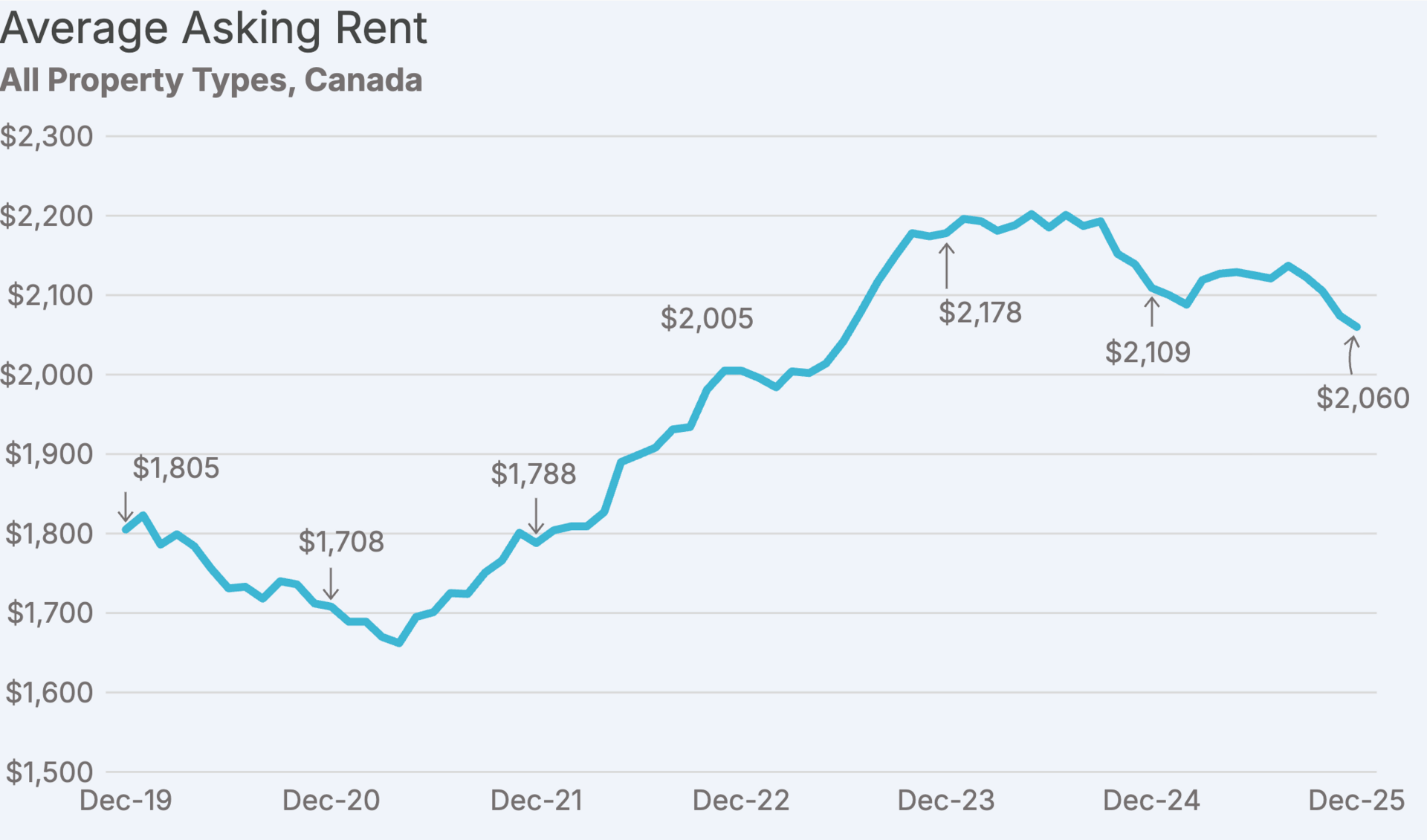 The latest Rentals.ca National Rent Report puts the average asking rent at $2,060, with rents dropping for 15 months in a row.